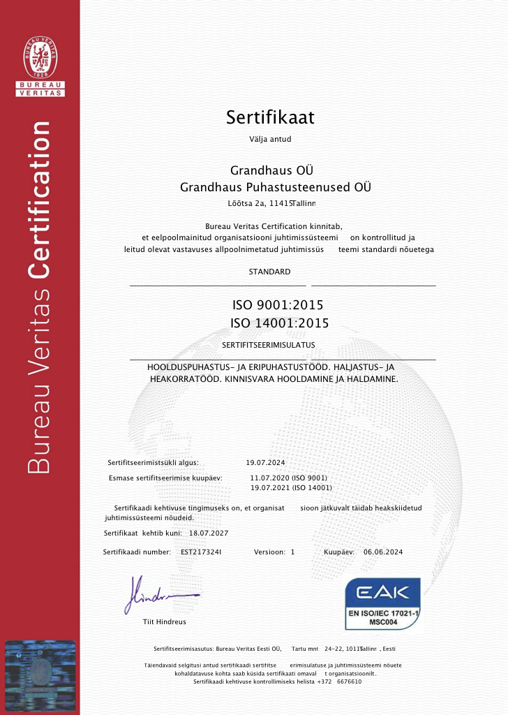 Grandhaus Grupi juhtimissüsteem vastab rahvusvaheliselt tunnustatud juhtimissüsteemide standardite ISO 9001:2015 ja ISO 14001:2015 tagamaks teenuste teostamise nõuetele vastavust, kvaliteeti, tähtaegadest kinnipidamist ning keskkonnasäästlikkust.